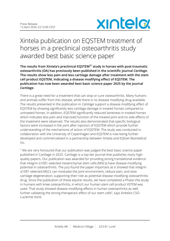 There is a great need for a treatment that can stop or cure osteoarthritis. Many humans and animals suffer from this disease, while there is no disease modifying drug available. The results presented in the publication in Cartilage support a disease modifying effect of EQSTEM by showing significantly less cartilage damage in treated horses compared to untreated horses. In addition, EQSTEM significantly reduced lameness in treated horses which indicates less pain and improved function of the treated joint and no side effects of the treatment were observed. The results also demonstrated that specific biological factors were increased in the joint after injection of EQSTEM which provide further understanding of the mechanisms of action of EQSTEM. The study was conducted in collaboration with the University of Copenhagen and EQSTEM is now being further developed and commercialised in a partnership between Xintela and EQGen Biomedical Inc.