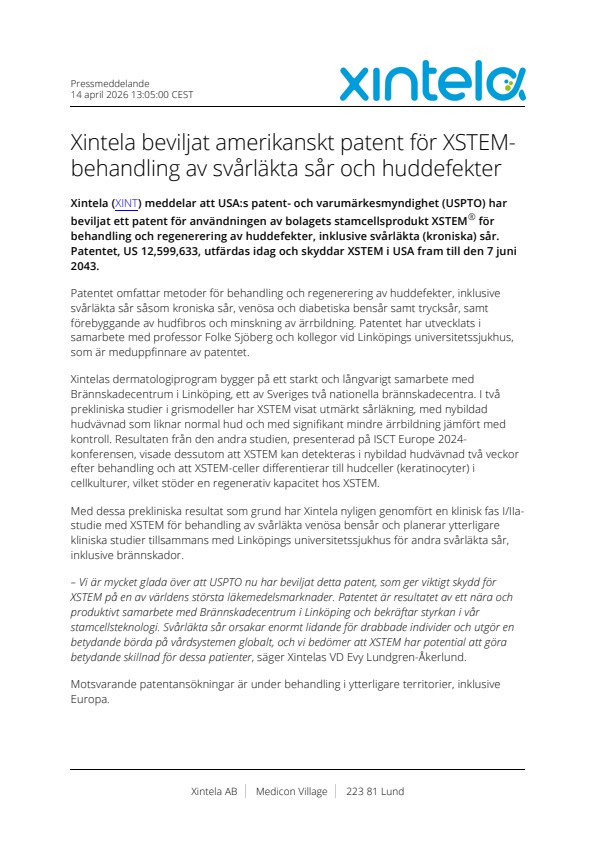 – Vi är mycket glada över att USPTO nu har beviljat detta patent, som ger viktigt skydd för XSTEM på en av världens största läkemedelsmarknader. Patentet är resultatet av ett nära och produktivt samarbete med Brännskadecentrum i Linköping och bekräftar styrkan i vår stamcellsteknologi. Svårläkta sår orsakar enormt lidande för drabbade individer och utgör en betydande börda på vårdsystemen globalt, och vi bedömer att XSTEM har potential att göra betydande skillnad för dessa patienter, säger Xintelas VD Evy Lundgren-Åkerlund.