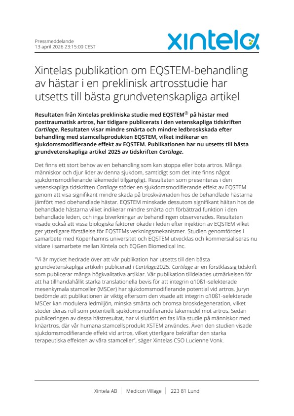 Resultaten från Xintelas prekliniska studie med EQSTEM® på hästar med posttraumatisk artros, har tidigare publicerats i den vetenskapliga tidskriften Cartilage. Resultaten visar mindre smärta och mindre ledbroskskada efter behandling med stamcellsprodukten EQSTEM, vilket indikerar en sjukdomsmodifierande effekt av EQSTEM. Publikationen har nu utsetts till bästa grundvetenskapliga artikel 2025 av tidskriften Cartilage.