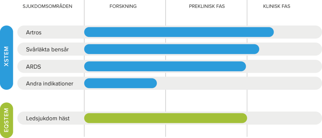 Baserat på bolagets unika teknologi för stamcellsselektion har Xintela utvecklat stamcellsprodukten EQSTEM® för behandling av hästar. EQSTEM® har visat säkerhet och effekt i två prekliniska artrosstudier på hästar. Xintela har ingått ett samarbets- och licensavtal med EQGen Biomedical Inc. för fortsatt utveckling och kommersialisering av EQSTEM® och stamceller för andra djur.